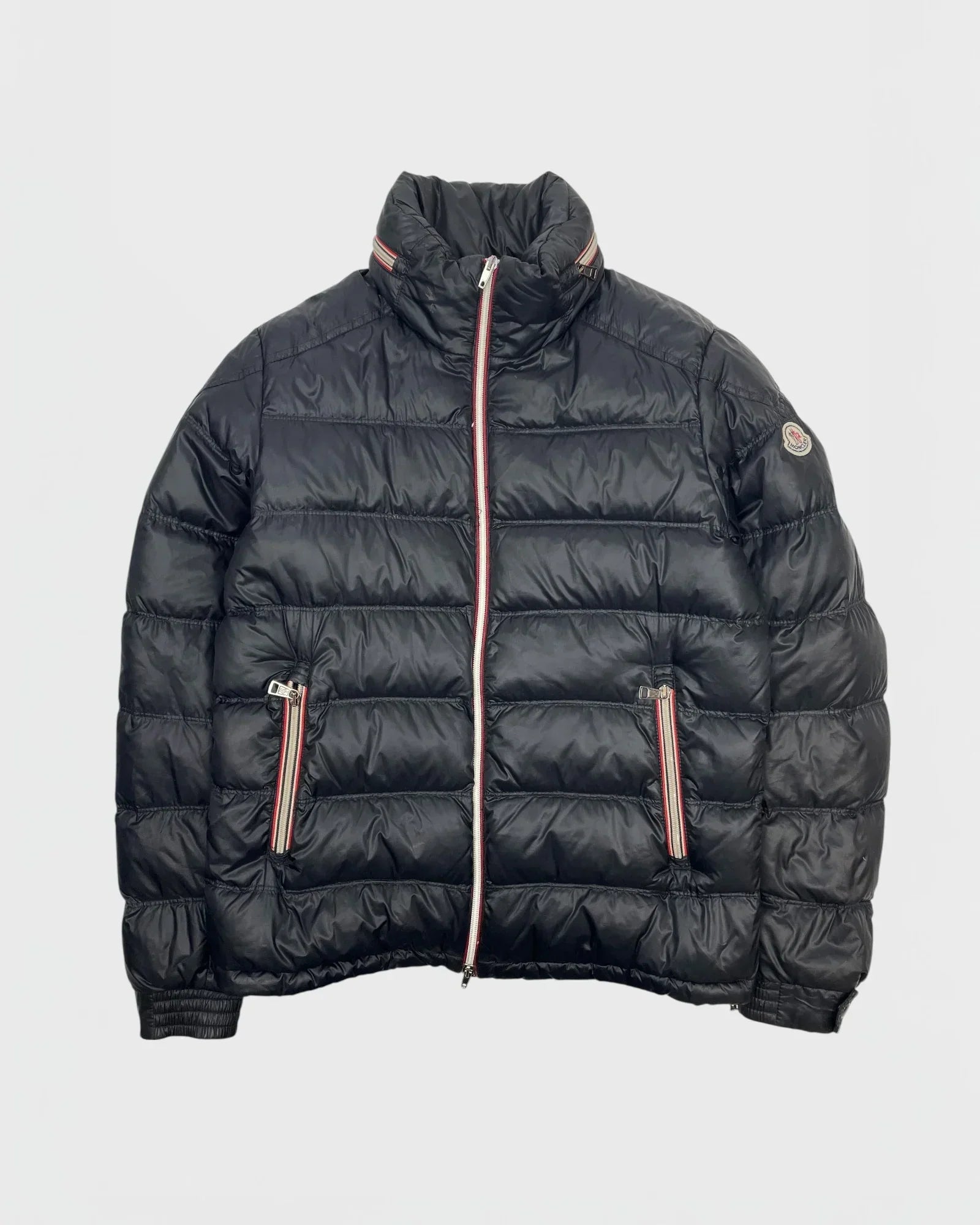 Doudoune en duvet matelassée noire, fermeture éclair et détails de textile tricolore (rouge/blanc/bleu) sur zip et col, logo Moncler cousu sur la manche gauche, poches zippées, intérieur doublé, col montant.