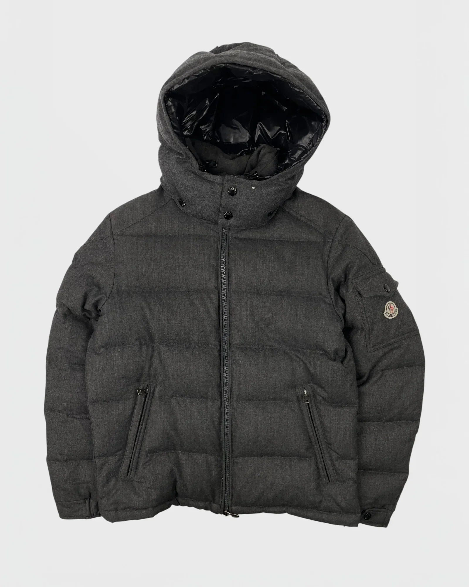 Doudoune matelassée grise, capuche amovible, doublure intérieure noire brillante, patch logo Moncler sur la manche, poches zippées, fermeture éclair frontale.