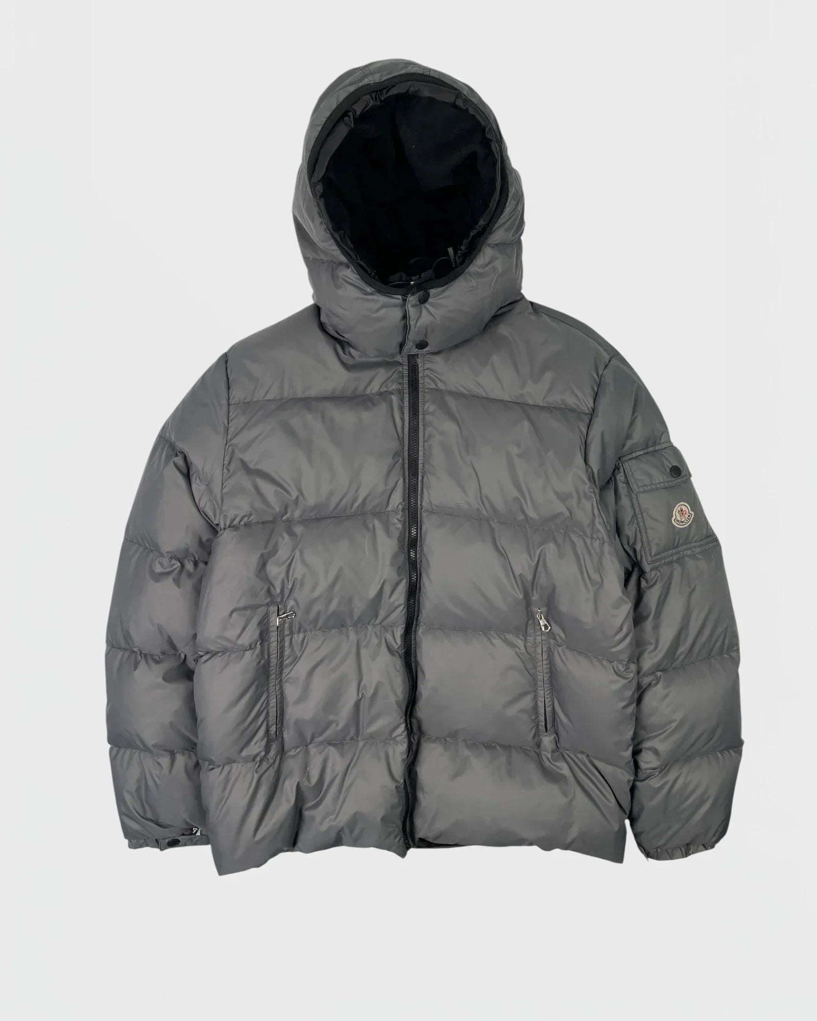 Capuche intégrée, poches zippées devant, logo Moncler sur la manche, fermeture éclair centrale, matelassage horizontal, intérieur noir, poche intérieure, étiquette Moncler visible. Légère trace sur le devant.