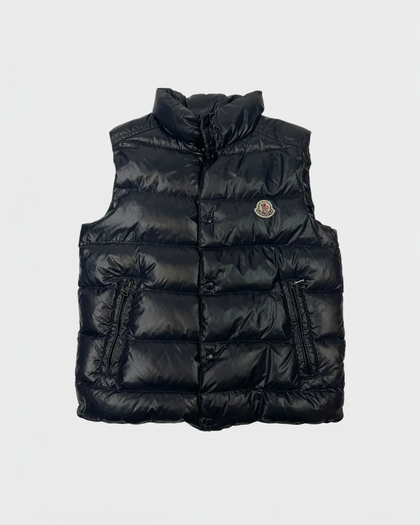 Sans manches, noir brillant, patch Moncler poitrine, zip et pressions, doublure Moncler, poches latérales zippées.